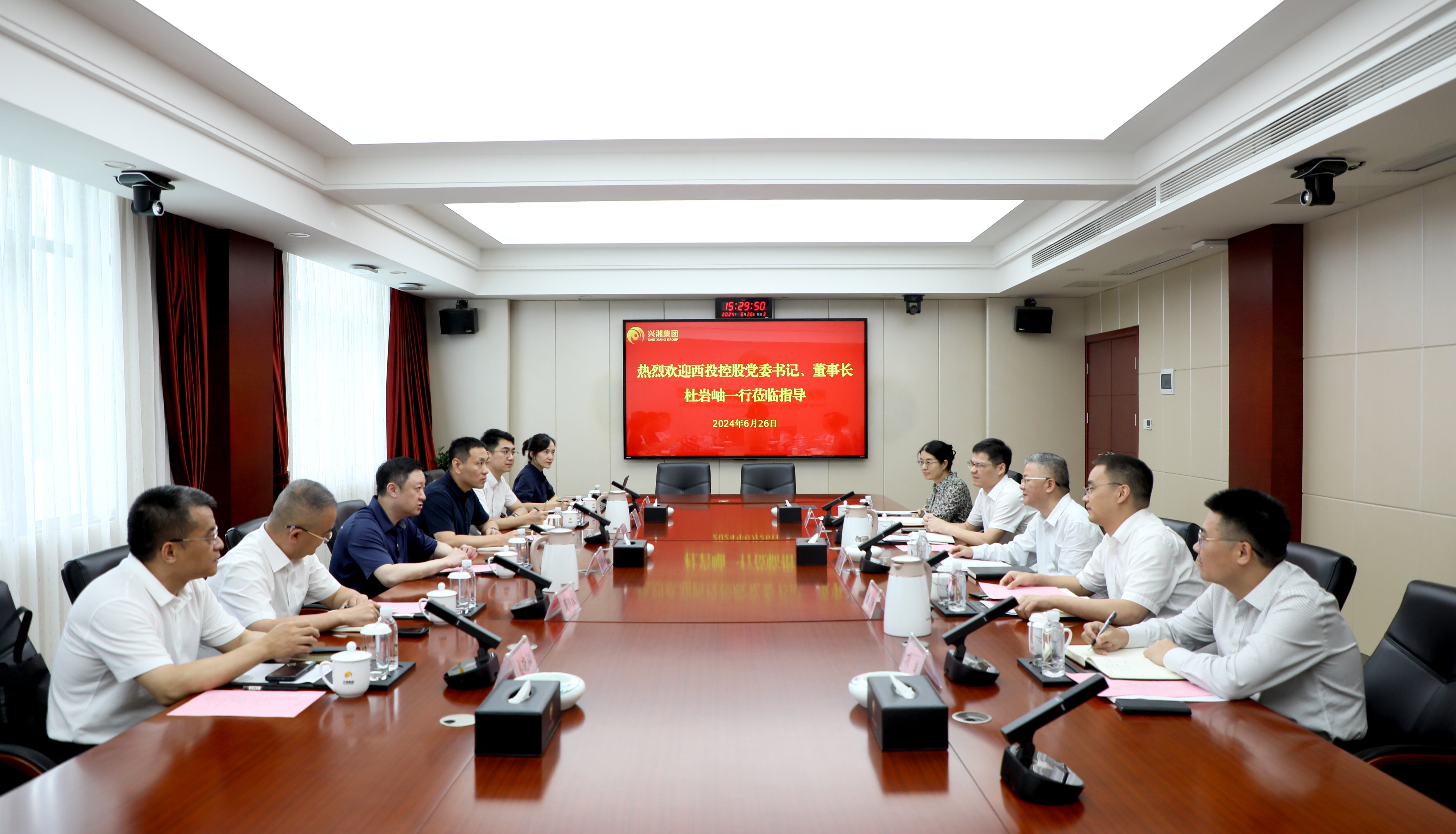6月26日,興湘集團黨委書記、董事長賀柳與到訪的西安投資控股有限公司黨委書記、董事長杜巖岫交流座談。西投控股風控總監孫鑫,興湘集團總經濟師、董事會秘書戴志利參加座談。